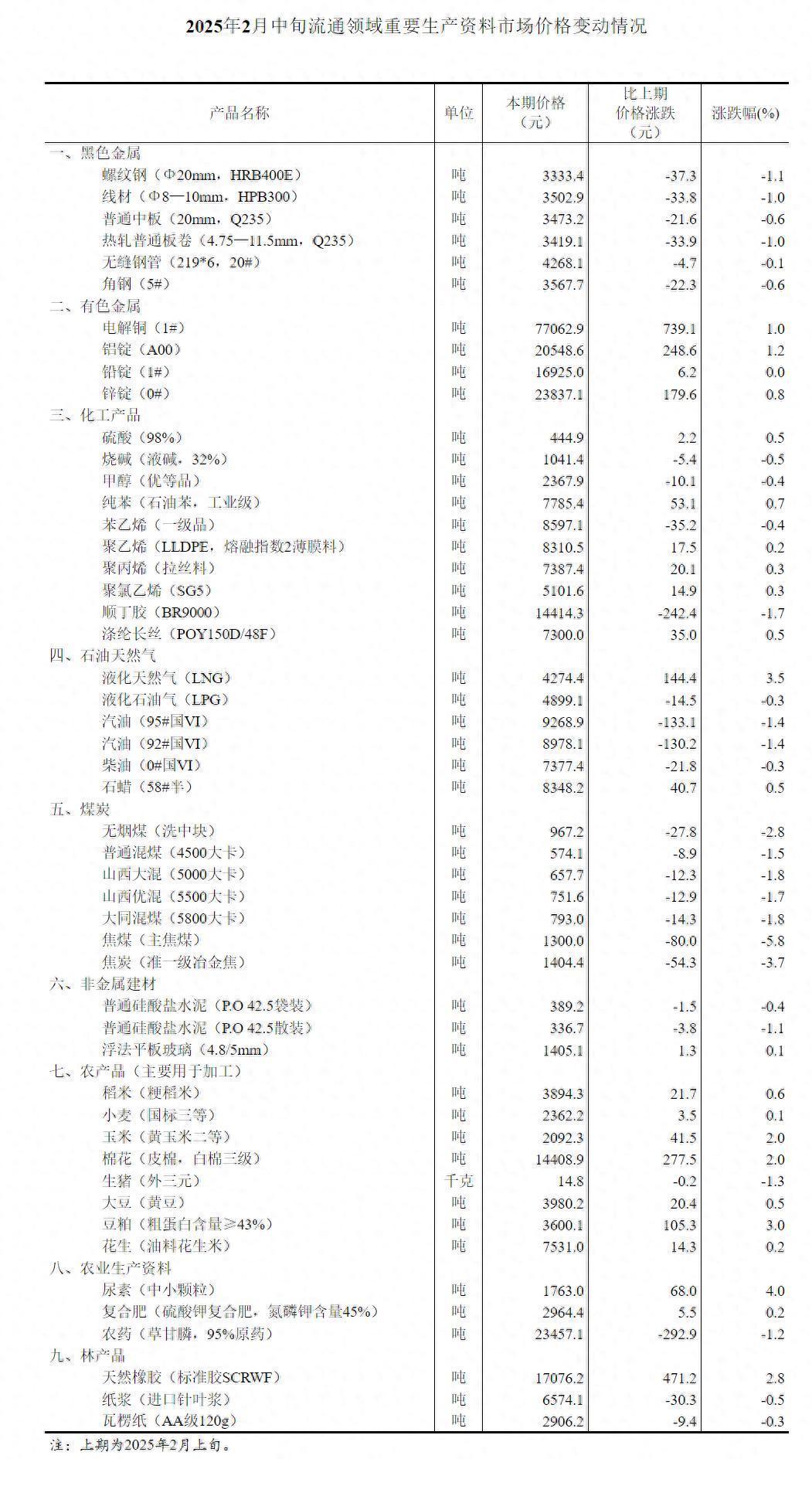 2025年2月中旬流通领域重要生产资料市场价格变动情况